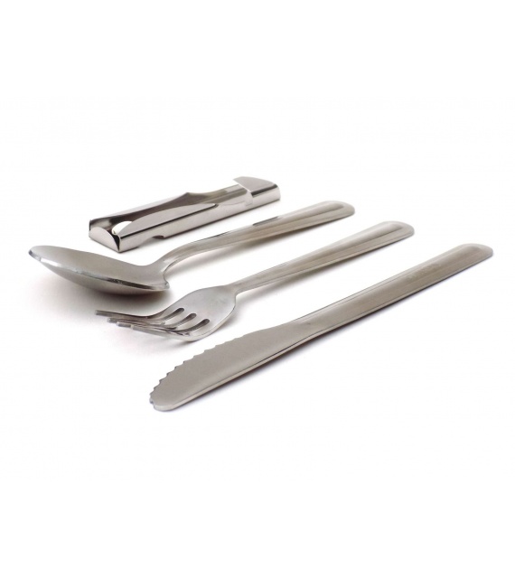 Štvordielná turistická sada príborov obsahujúca kombinovaný otvárak na konzervy a fľaše, do ktorého je možné vložiť lyžicu, vidličku a nôž.