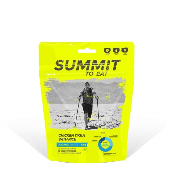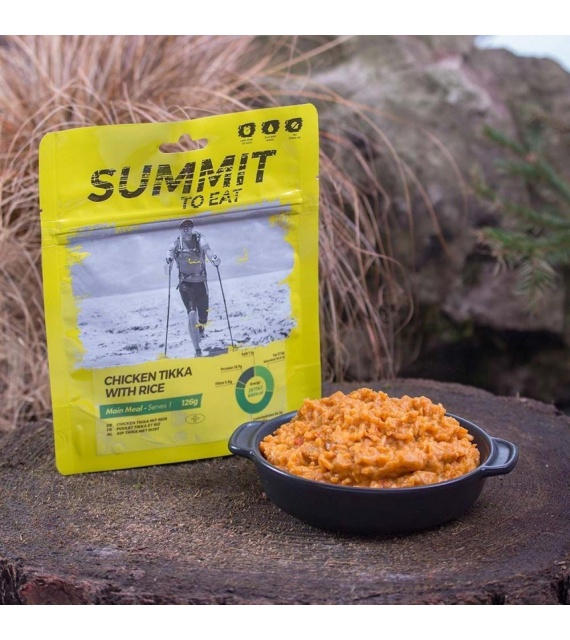 Dlhozrnná ryža (30%), krájané paradajky (11%), cibuľa, kuracie mäso (13%), smotana (mlieko), biely jogurt (mlieko), repkový olej, Tikka Curry pasta (3%), vínny ocot, paradajkový , drvený koriander, cukor, mletá paprika, morská soľ, odstredené sušené mlieko, koncentrovaná citrónová šťava, drvená rasca, drvená pískavica (Grécke seno), kardamómový prášok, Chilli, kyselina mliečna, bobkový list, zahusťovadlo (Xanthan) , kukuričná múka, Chilli.