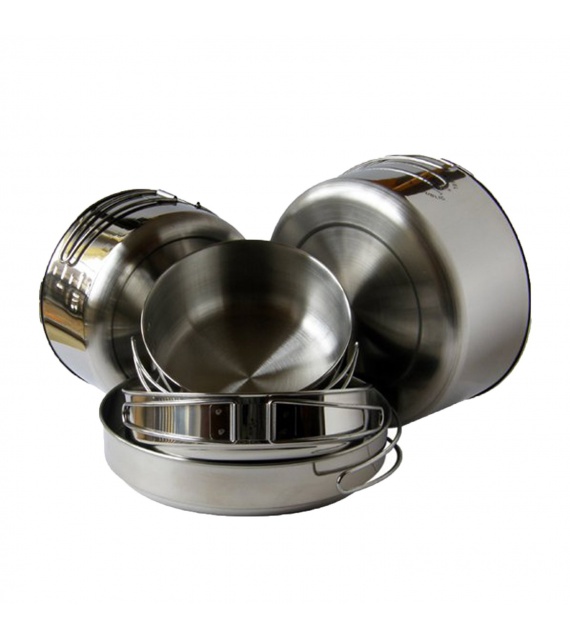 Päťdielna nerezová sada riadu ALB EVEREST z kvalitnej nerez ocele. Súprava odolného kempingového riadu so sklopnými uši v praktickom sieťovanom puzdre. Vyrobené v Česku.