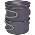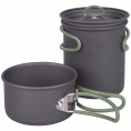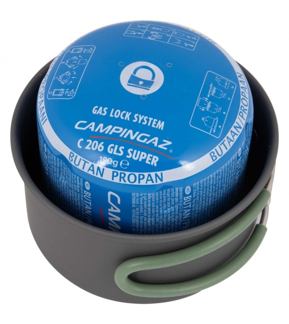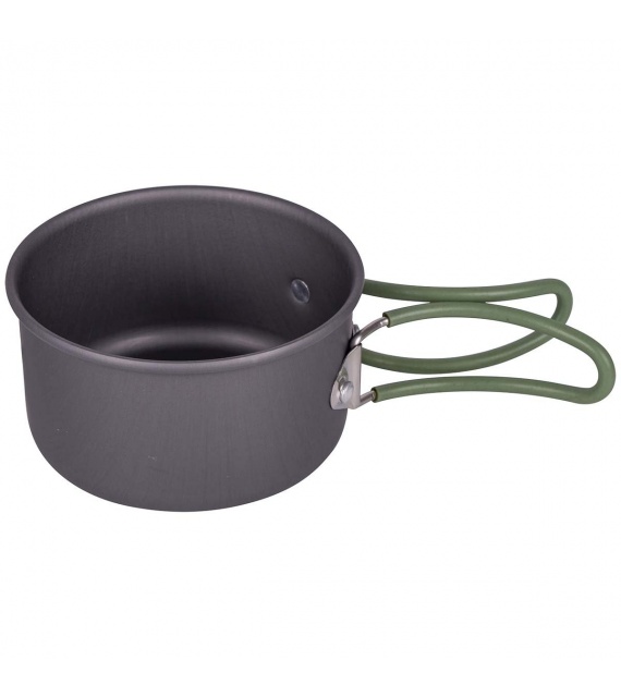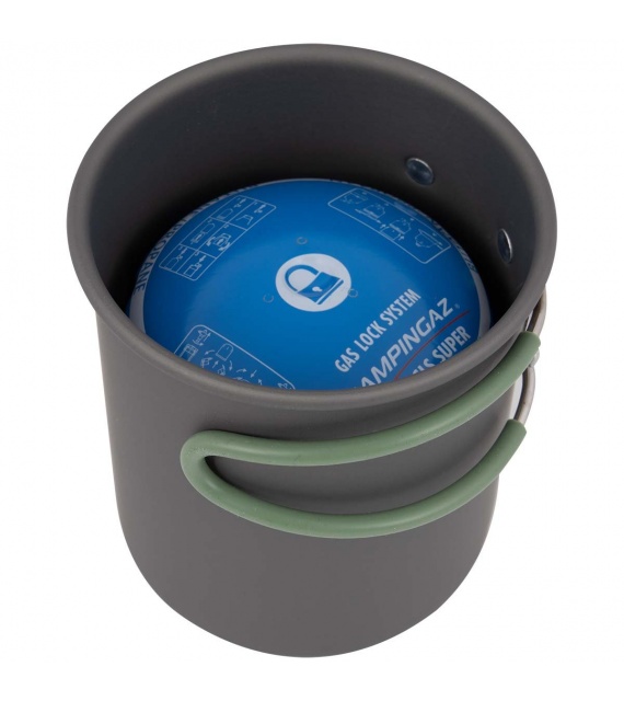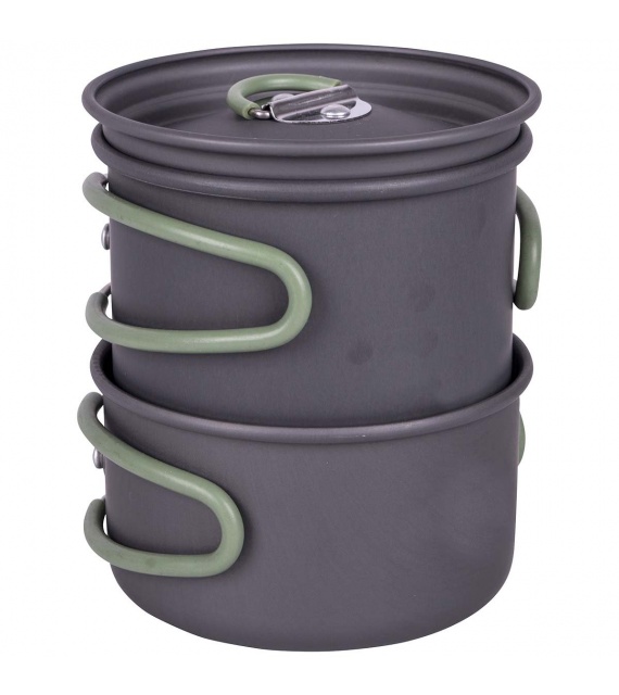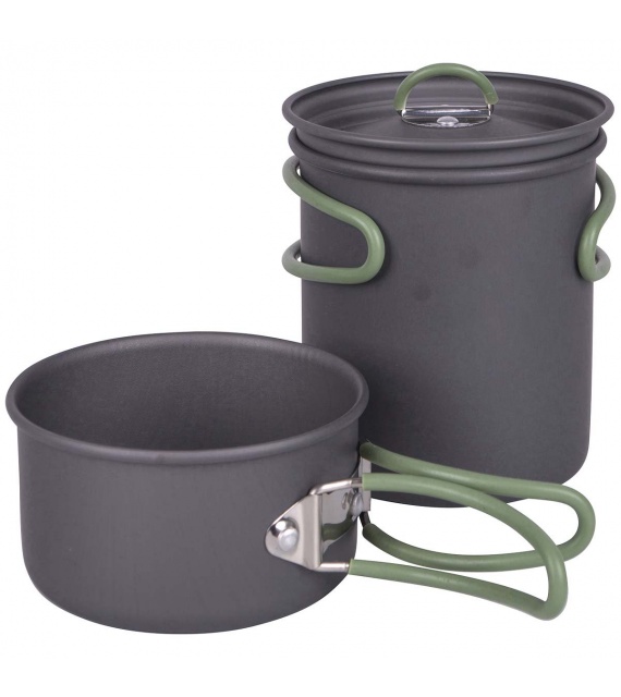 2dielna ľahká sada na varenie. Táto sada sa skladá z 2 hrncov a 1 pokrievky. Vyrobené z odolného tvrdého eloxovaného hliníka a opatrené tepelne odolnou silikónovou skladacou rukoväťou. Túto rukoväť je možné po použití ľahko zložiť okolo panvice, vďaka čomu sú panvice kompaktné na skladovanie a prepravu. Vhodné pre plynové a benzínové horáky. Tieto panvice majú znížené riziko prilepenia. Táto sada panvíc ponúka dostatok priestoru na uloženie kazety Campingaz C-206. Vrátane puzdra.